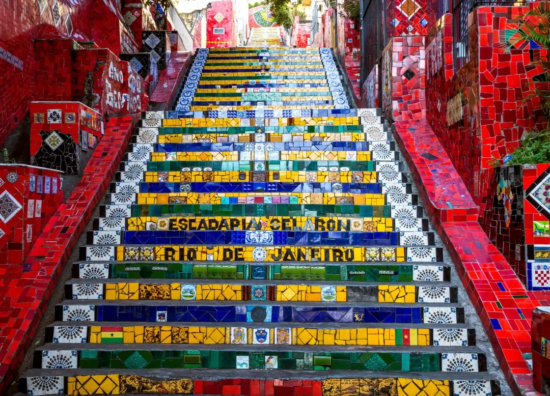 The tour concludes at the Selarón Steps, the world-famous colorful staircase that connects Santa Teresa to the vibrant Lapa district.