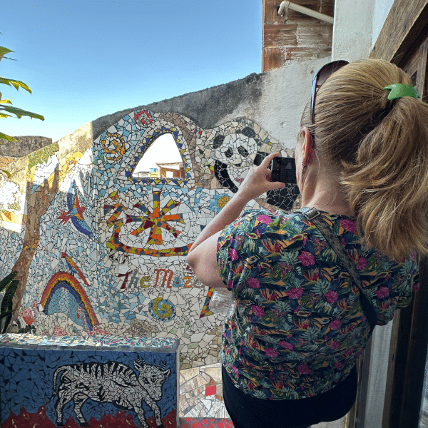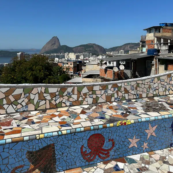 You will begin the experience at the iconic The Maze, a unique construction started by an English journalist named Bob. Here, terraces and viewpoints are adorned with mosaics created by local and international artists, forming a living work of art. From this location, you can enjoy panoramic views of Sugarloaf Mountain and the entrance to Guanabara Bay, connecting you with the landscape that earned Rio the UNESCO World Heritage Site title in the Urban Cultural Landscape category.